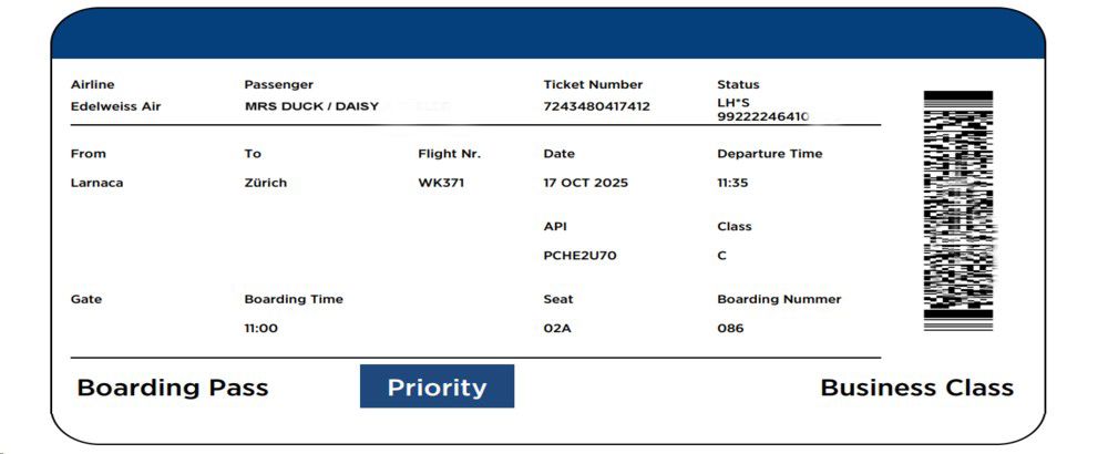 - Upgrade Edelweiss von Economy auf EcoMAX, pro Person / Strecke Fr. 30.00 (damit werden u.a. die Kreditkartengebühren gedeckt)